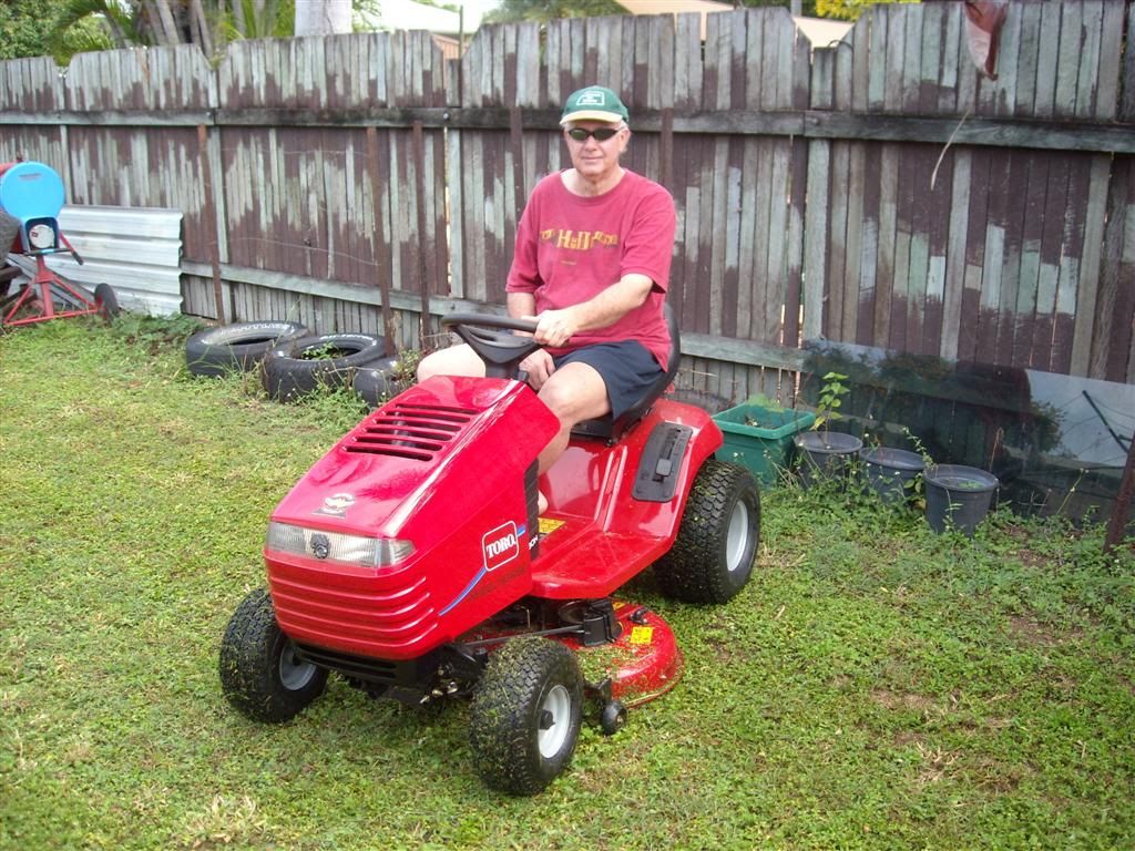 He has been practicing on the mower..... He makes HARLEY NOISES as he burns up & down the lawn..