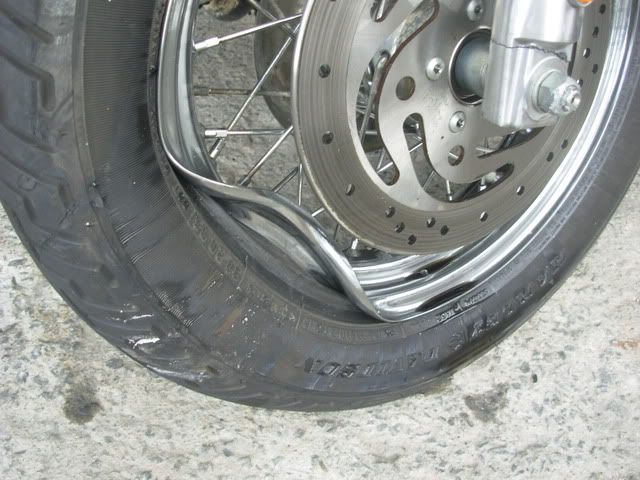 I haven't seen the bike as yet ("Lay there - DO NOT MOVE" said the registered Nurse who just happened along) but one bystander told me it's a write-off; s'pose I'll find out Monday. For the short term that's one less Harley on the roads.