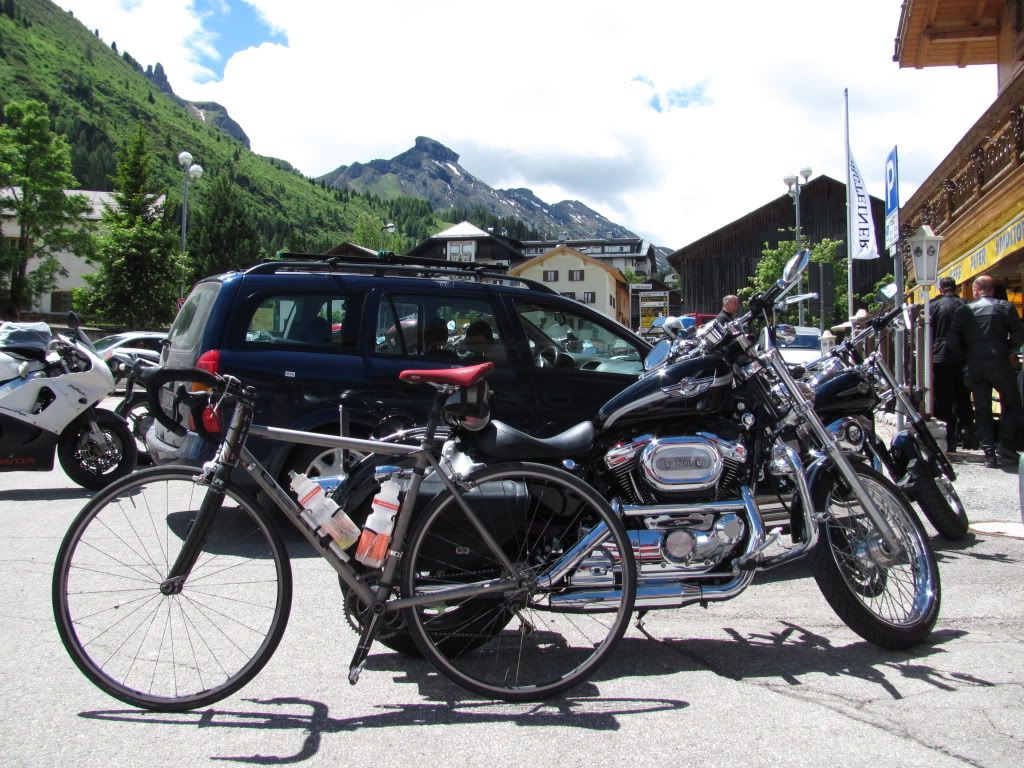 This German guy was happy to let me park my bike against his Sportster in the Italian alps.