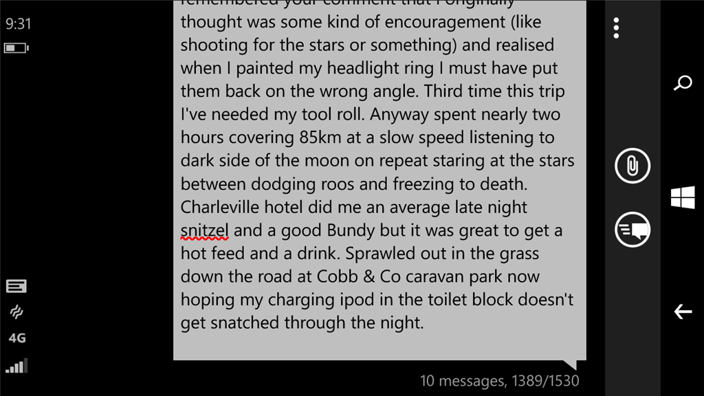 After a warm wash up I set off. It was probably a lovely spring day for country New South Welshman but the wind chill factor was really biting through my makeshift winter gear. My Bear Grylls instinct kicked in and I considered Han Solo-ing open one of the many roadside cows and taking shelter. Instead I pulled over for a red bull and used the exhaust warmth to get the feeling back in my fingers.