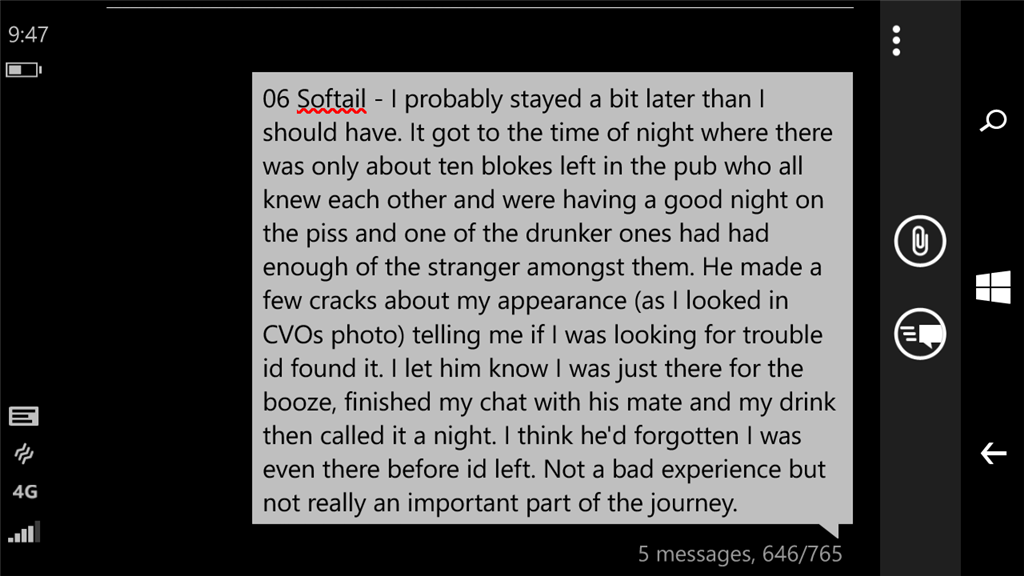 JFE - The bike was very comfortable for the distance. A screen definitely would have helped against some of those strong cross winds and taken a bit of a chill out of the last day, but I wasn't sitting there wishing I had one. Saying that I didnt go any faster than 130KMH the whole trip so if I was sitting at a higher speed I might have wanted one. My seat was comfy the whole way, I think my particular model came with a good seat because I've seen people buying it for other bikes, my mate got one for his wide glide after trying mine. The forward controls were fine, made for a good relaxed position. Occasionally I'd change it up and sit upright with a 90 degree bend in the elbows and my feet on the passenger footpegs, being able to change the position helped get the blood flowing and not stiffen up in one position. I would happily do that trip again or equally long trips without getting a screen.