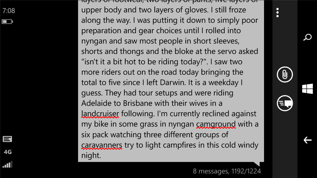 If I were to do the trip again the only thing I would do differently would be to have ordered some winter gear. By the time I'd been to the three Darwin bike shops and realised there's nothing for cold weather available (because there's no cold weather in Darwin) it was too late to order anything online. I still enjoyed my last day and half in the cold however I couldn't ride at my full capacity as I had stiff joints and therefore less control than I needed to ride properly.