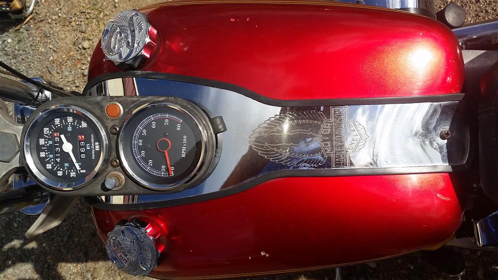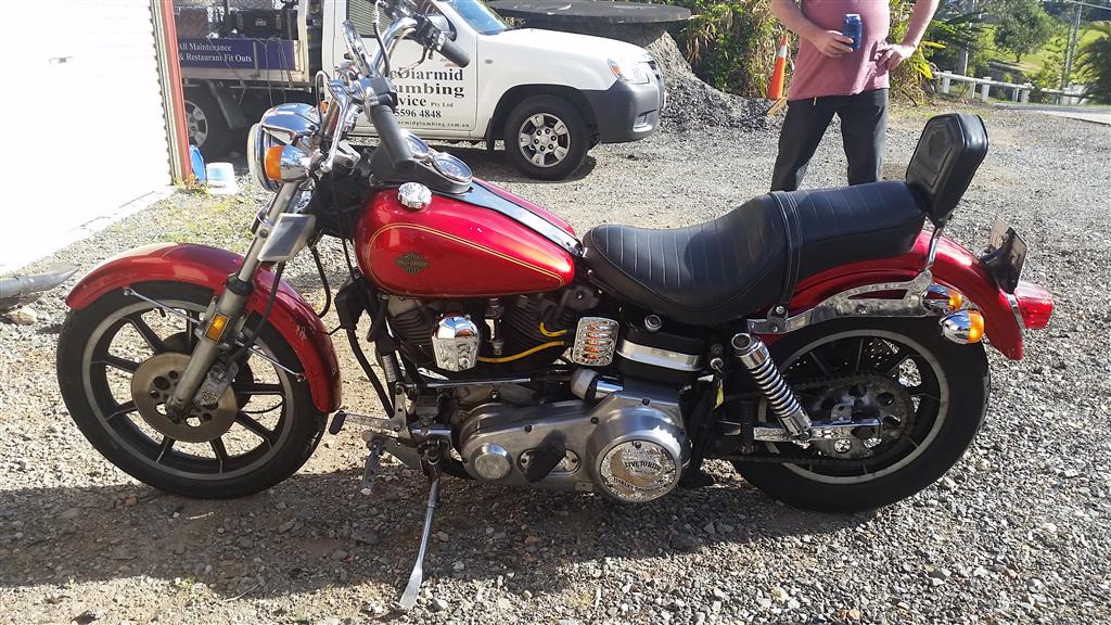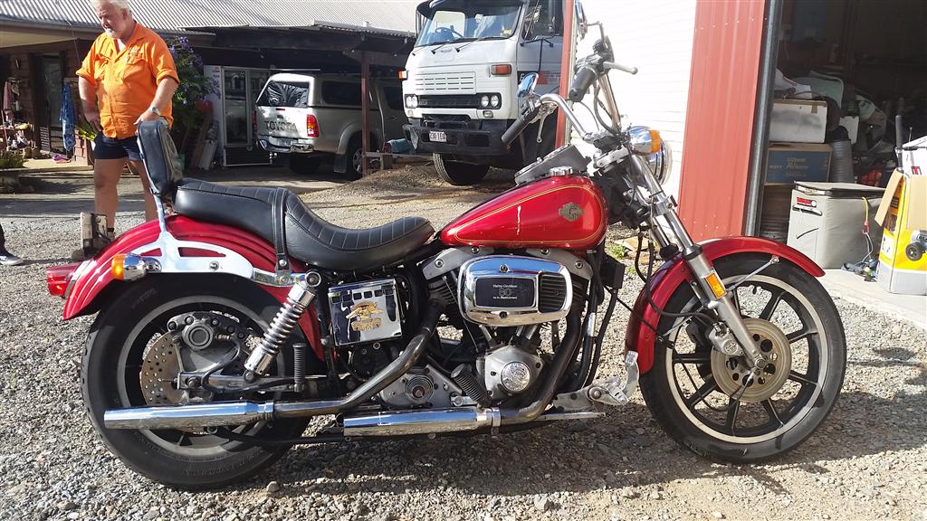 So I just bought an 81 Superglide Fat Bob in original and reasonable condition. Been sitting in a shed for about 3 yrs, owner started it every 2 or 3 weeks. Gear box was rebuilt a few years ago when he was riding it. Only 41k on the clock, was told original k's. Starts, idles and runs just fine. Rode it home some 15 km with no dramas. Comes with period bags which need tidying up.