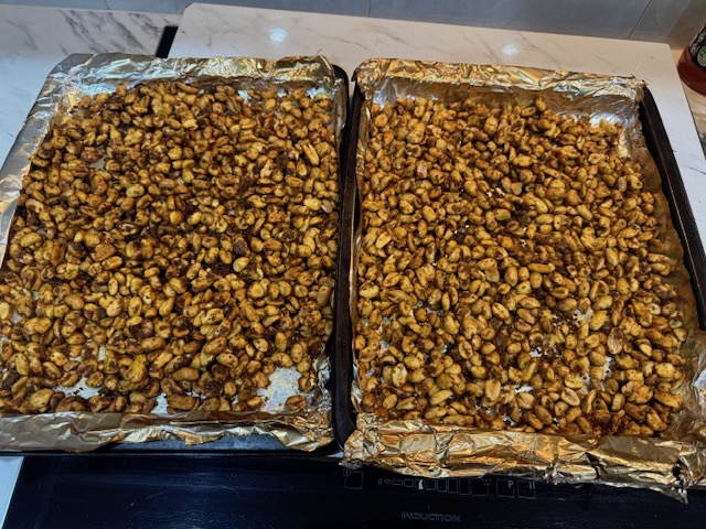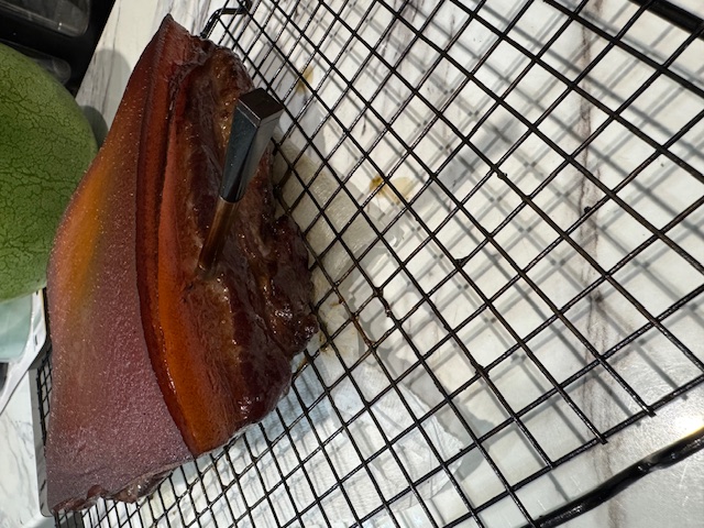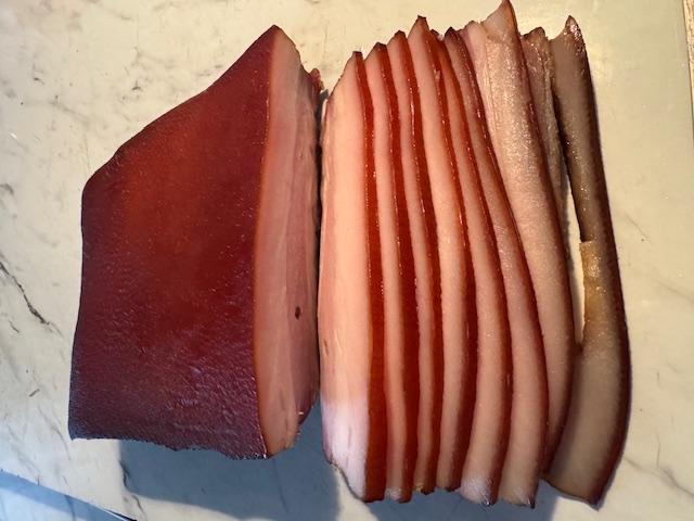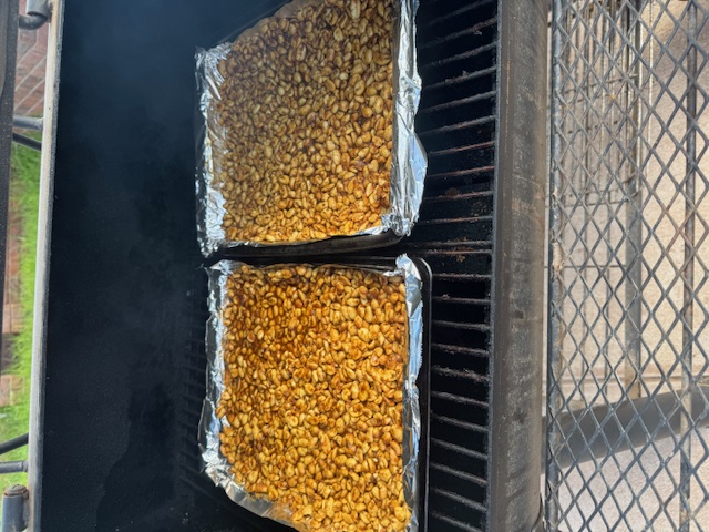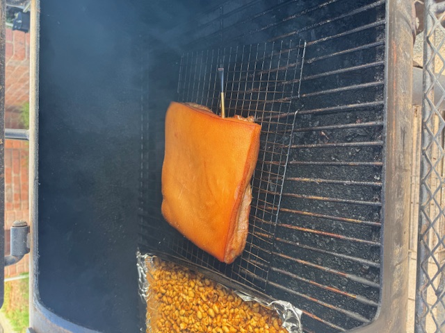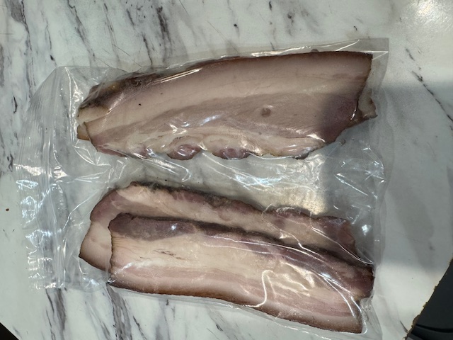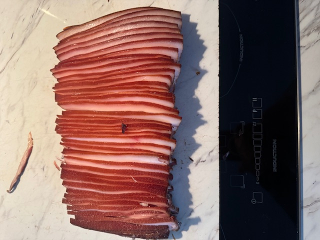 My first try at bacon7 days to cure, two hours in the smoker (with some peanuts), I think it is cheaper to buy bacon, but they say this does taste better. was fun to do, likely will do again